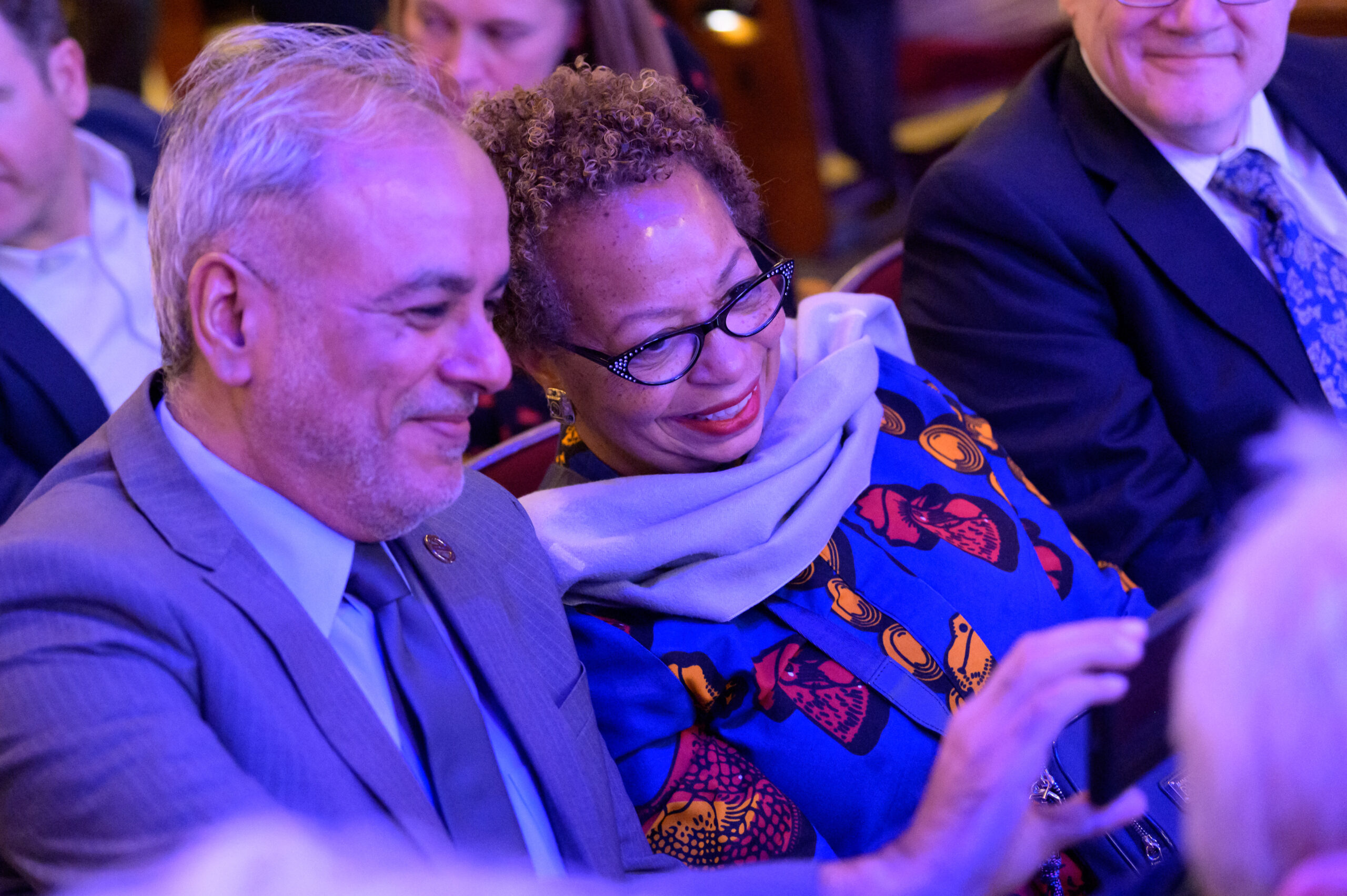 President Joanne Berger-Sweeney takes a selfie with State Senator Saud Anwar before the Connecticut Forum’s conversation between Liz Cheney and David Ignatius on March 14. The week after the forum, the president invited those who attended from the College community to reflect on the conversation as part of the Bridging Divides series, which promotes small group discussions about challenging topics that shape our viewpoints but also may divide our society. Photo by Nick Caito courtesy of Connecticut Forum.