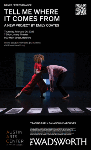 This locally relevant artist talk by Emily Coates and her collaborators Derek Lucci, Charles Burnham, and Adam Lenz comes to Trinity after a sold-out offering at Lincoln Center and before Coates’s new work, Tell Me Where It Comes From, is performed at The Wadsworth on February 26th.