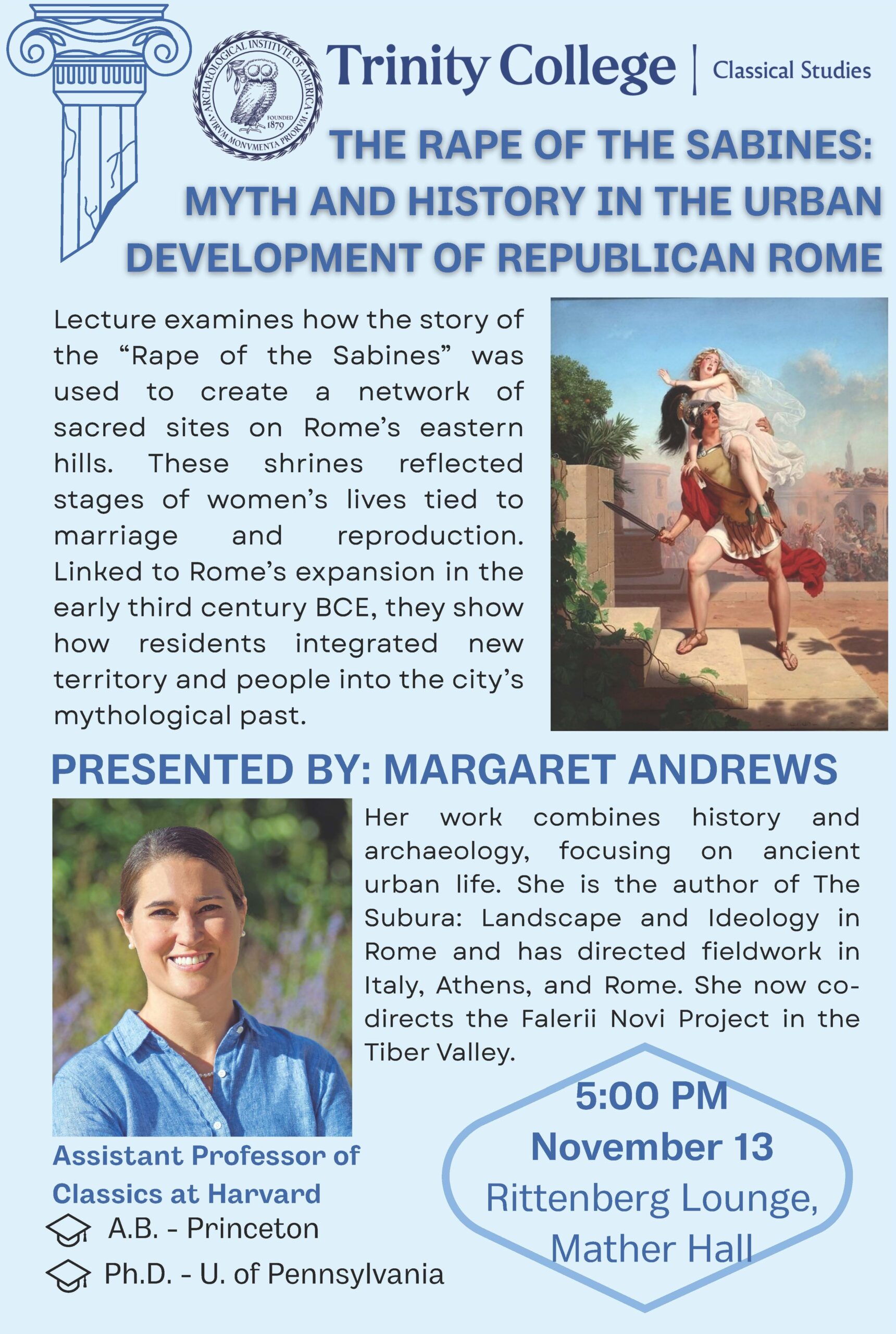 | Thursday, November 13, 2025 at 5:00pm – Rittenberg Lounge, Mather Hall , Trinity College Campus The Rape of the Sabines: Myth and History in the Urban Development of Republican Rome Abstract: This lecture analyzes how the legendary story of the “Rape of the Sabines” was used to construct a network of sacred sites conveying the value of feminine virtue across Rome’s eastern hills in the Republican period. It presents the archaeological and historical evidence for each of the sites and argues that they all pertained to a different aspect of the female lifecycle with respect to marriage and reproduction. The sites would have been linked to each other and to the narrative of the “Rape of the Sabines” during the early third century BCE, when M’. Curius Dentatus triumphed over these peoples. This was a period when Rome’s eastern hills were experiencing rapid population growth and urban development, as indicated by Dentatus’ subsequent construction of the Aqua Anio here. I argue that Dentatus and other residents of this area used the “Rape of the Sabines” and the network of female shrines to incorporate this part of the growing city and the newly-conquered Sabines into Rome’s mythological past. This moment in Rome’s development demonstrates the active role that Rome’s residents played in shaping not only the physical expansion of this area of the city but also its significance in Rome’s past and present. Co-sponsored by the AIA-Hartford Chapter and the Department of Classical Studies, Trinity College