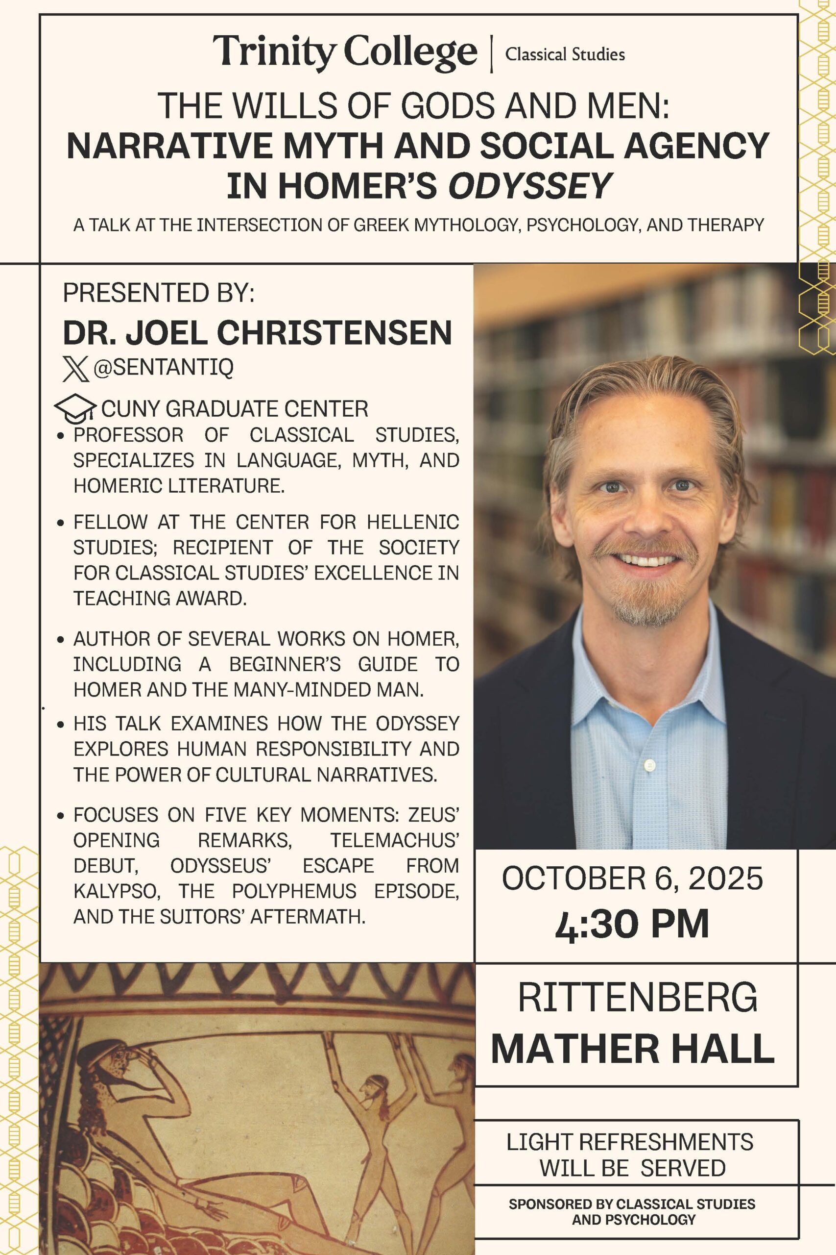 From the beginning of the epic, Homer’s Odyssey invites audiences to think about human responsibility for their own suffering. The epic dramatizes how cultural narratives influence what its characters do in the world and asks its audiences to consider how the stories of Odysseus, his family, and their community model human behavior in response to and against the narratives that shape them. This talk will focus on five crucial moments in this movement: Zeus’ comments at the beginning of the epic; the initial appearance of Telemachus in book 1; Odysseus’ escape from Kalypso in book 5; the story of the cyclops, Polyphemos in book 9; and the conflict between Odysseus and the suitors’ families at the epic’s end.