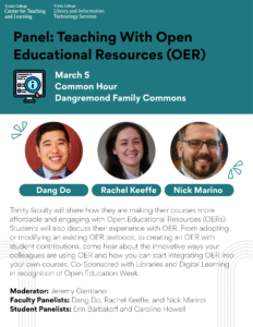 Trinity faculty, Dang Do (Political Science), Rachel Keeffe (Biology), and Nicholas Marino (Allan K. Smith Center for Writing and Rhetoric) will share how they are making their courses more affordable and engaging with Open Educational Resources (OERs). Student panelists, Erin Barbakoff and Caroline Howell, will also discuss their experience with OER. From adopting or modifying an existing OER textbook, to creating an OER with student contributions, come hear about the innovative ways your colleagues are using OER and how you can start integrating OER into your own courses. Moderated by Jeremy Garritano. Co-sponsored by Library & Information Technology Services in recognition of Open Education Week.