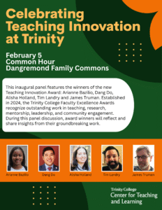 This inaugural panel features the winners of the new Teaching Innovation Award: Arianne Bazilio, Dang Do, Alisha Holland, Tim Landry and James Truman. Established in 2024, the Trinity College Faculty Excellence Awards recognize outstanding work in teaching, research, mentorship, leadership, and community engagement, with these five faculty members honored specifically for their curricular and pedagogical innovations that enhance student engagement and learning. During this panel discussion, award winners will reflect and share insights from their groundbreaking work.