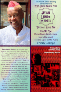 The Trinity College English Department welcomes acclaimed authors and poets to share their work with our community through the A.K. Smith Reading Series. These events celebrate the art of creative writing, offering students and faculty the chance to hear new voices, engage with established writers, and experience literature as a living, evolving practice.