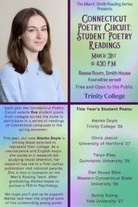 Each year, the Connecticut Poetry Circuit selects five student poets from colleges across the state to take part in a series of readings at Connecticut campuses during the spring semester. Trinity is eager to support this tradition and to celebrate the creativity of its students, whose voices and talents continue to enrich both our campus and the wider literary community.