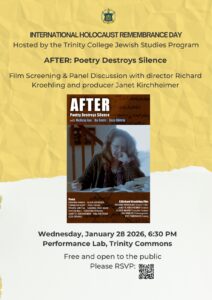 In honor of International Holocaust Remembrance Day, the Trinity College Jewish Studies Program presents a screening of AFTER: Poetry Destroys Silence, followed by a panel discussion with director Richard Kroehling and producer Janet Kirchheimer.