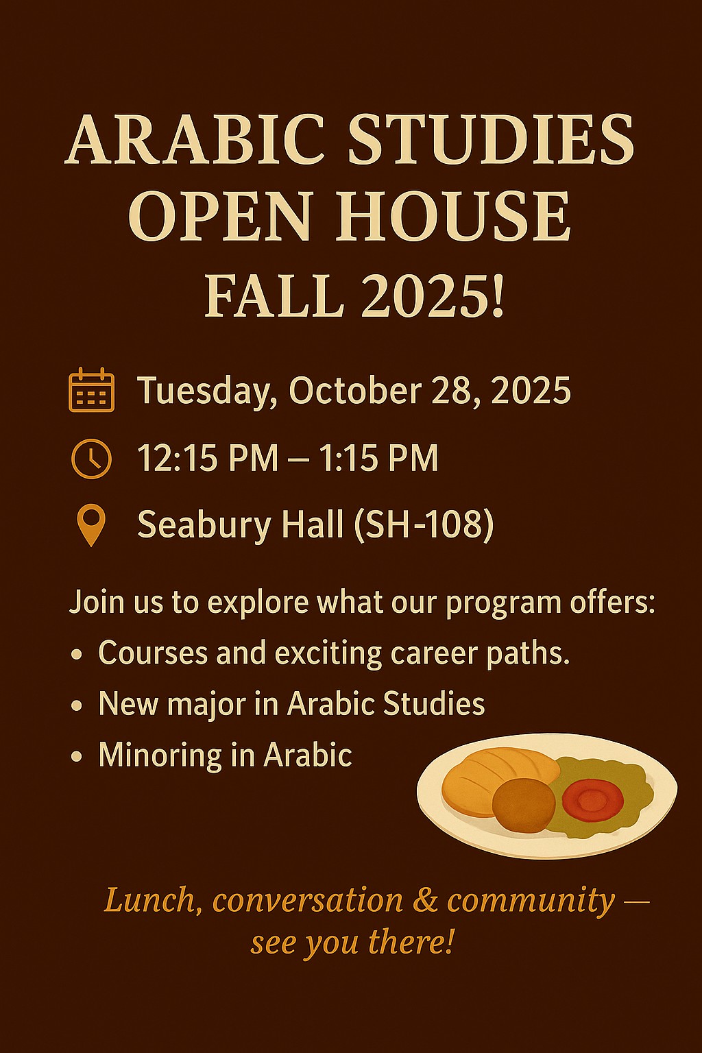 Join us for an engaging hour of lunch, conversation, and community while learning about exciting opportunities in Arabic Studies. This is a wonderful chance to explore something new, meet fellow students and faculty, and celebrate the richness of Arabic language and culture—all in one inspiring event.