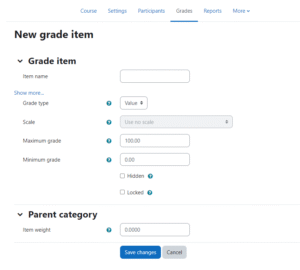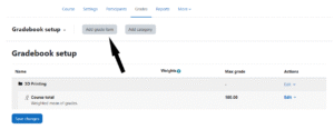 Then, select Add Grade Item to adjust the item name, grade type and minimum and maximum grade. Once done, click save changes to get back to the gradebook set up view with your new grade item.
