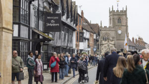 A crowd watches the Shakespeare Birthday Procession on Chapel Street in Stratford-Upon-Avon. Photo by Jeff Land Photography.