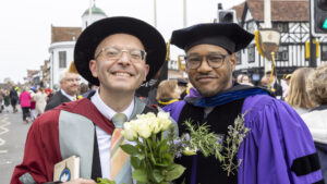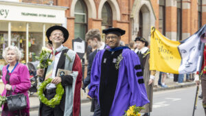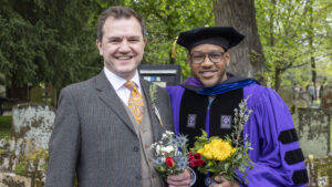 Rev. Dr. Paul Edmondson and Associate Professor of English David Sterling Brown ’06 carrying flowers in the Shakespeare Birthday Celebration Procession on the way to Holy Trinity Church. Photo by Jeff Land Photography.