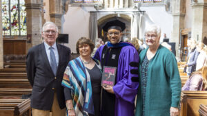 Trinity College President Emeritus James F. Jones; Milla Cozart Riggio, James J. Goodwin Professor of English, Emerita; Associate Professor of English David Sterling Brown ’06; and Jan Jones at Holy Trinity Church after the Sunday Service. Photo by Jeff Land Photography.