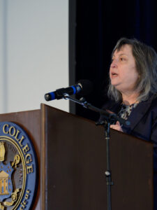 Sarah A Raskin, associate dean for faculty development and Charles A. Dana Professor of Psychology and Neuroscience, introduces the fireside chat between President Dan Lugo and D. Holmes Morton, M.D., IDP’79, H’90.
