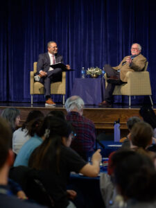 Trinity College President Dan Lugo joins D. Holmes Morton, M.D., IDP’79, H’90 for a ‘fireside chat.’