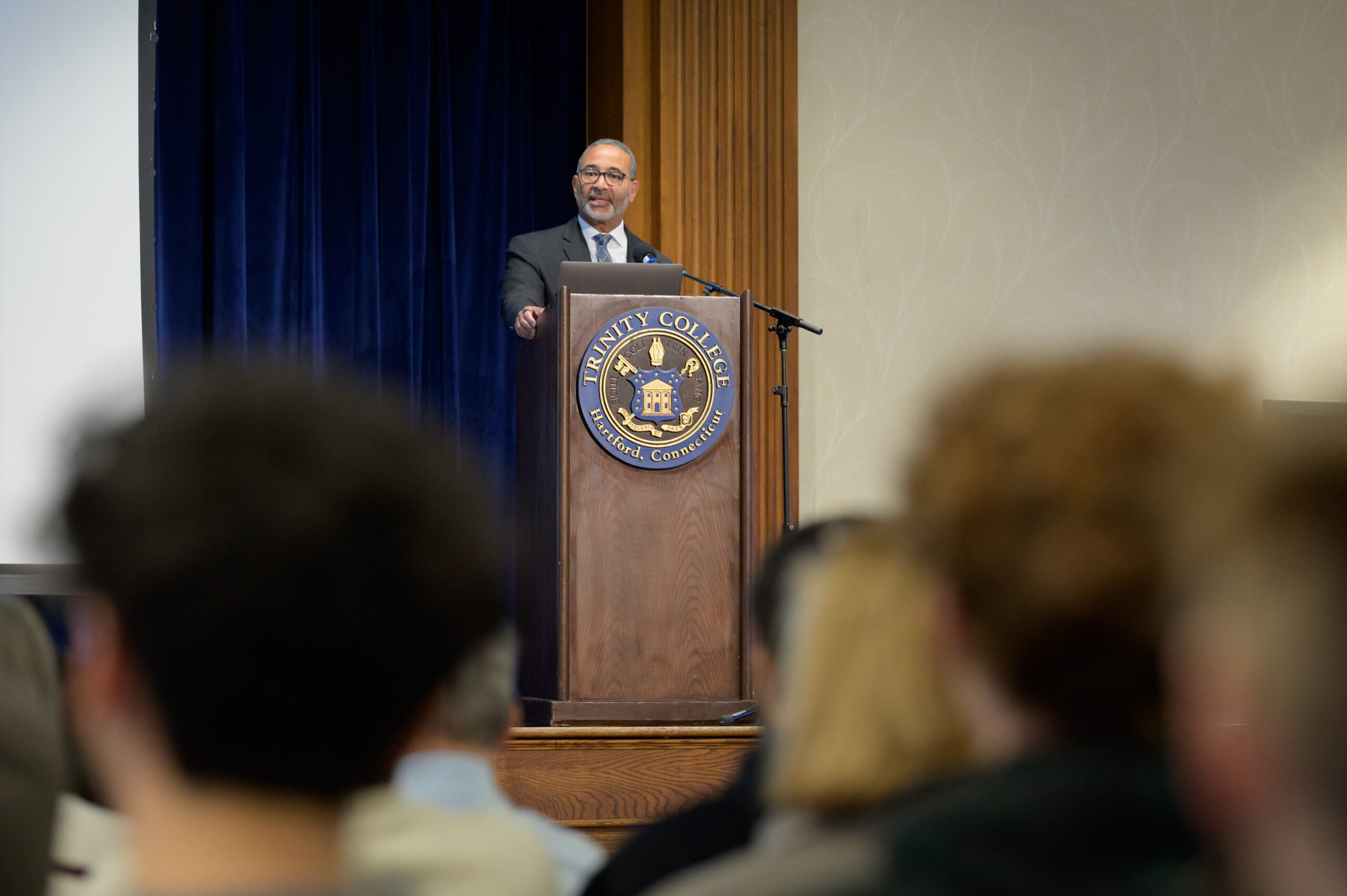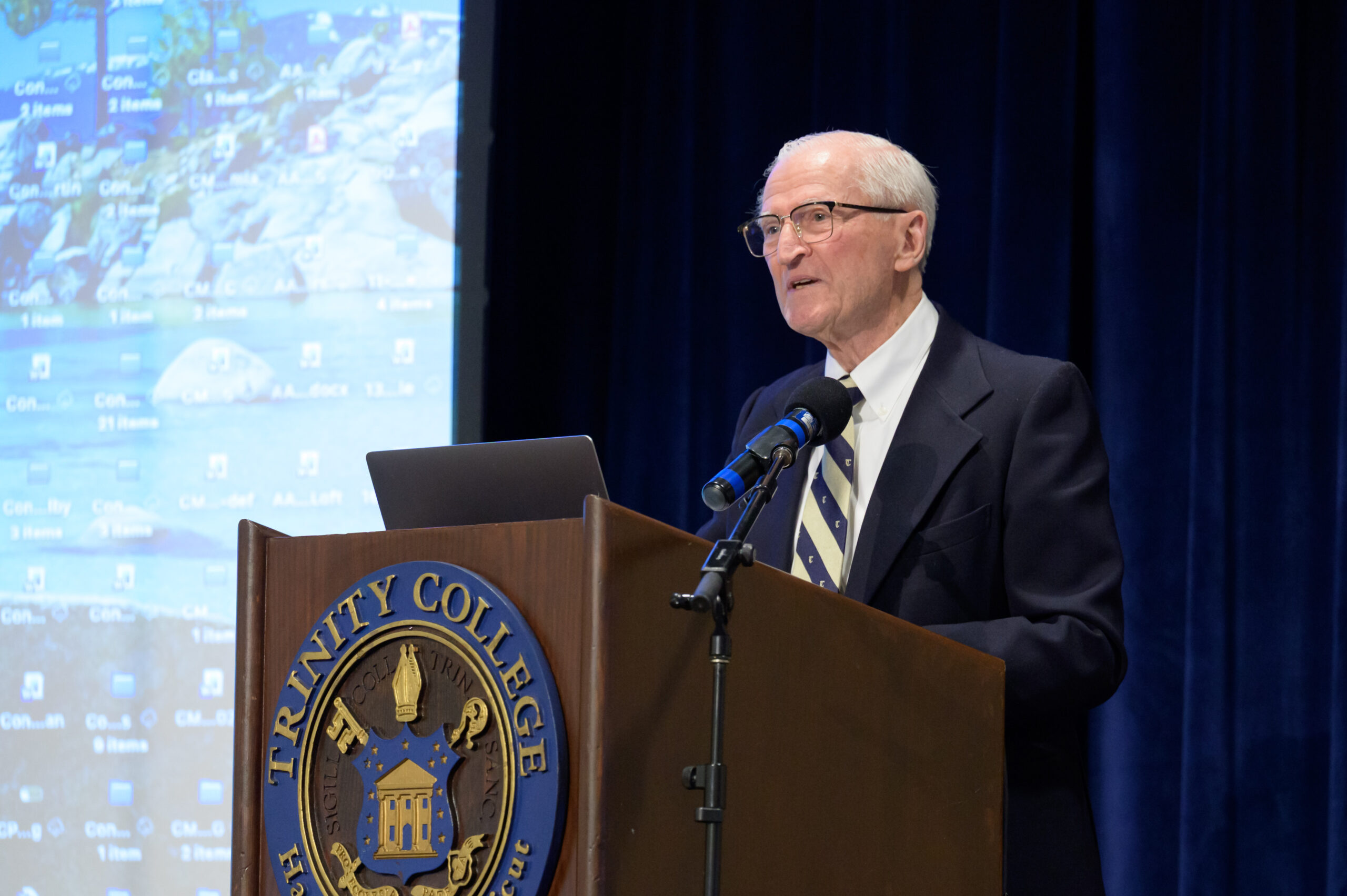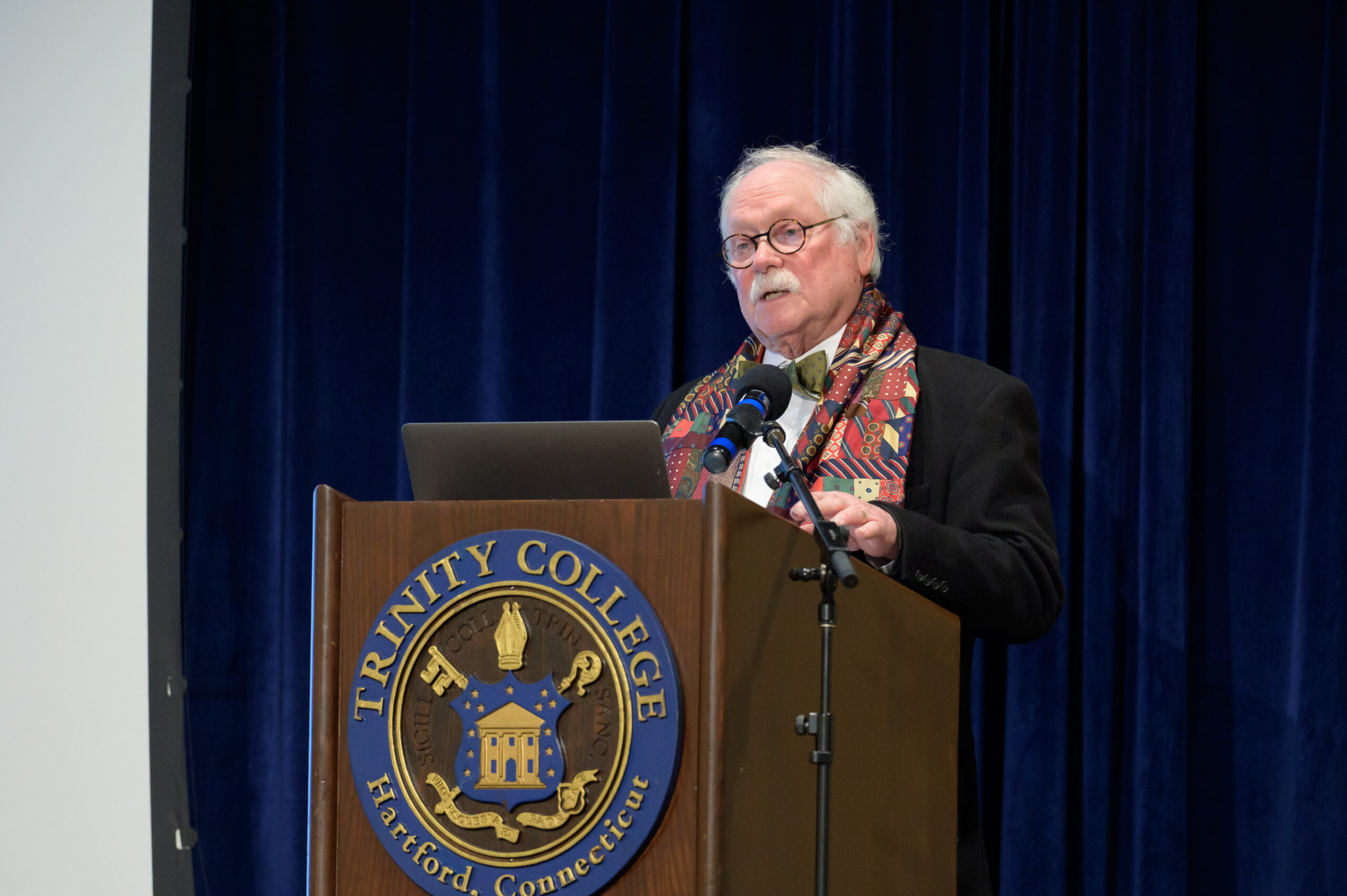 Trinity College President Dan Lugo speaks before presenting D. Holmes Morton, M.D., IDP’79, H’90 with the 2025–2026 Trinity College President’s Medal for Science and Innovation.