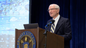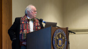 D. Holmes Morton, M.D., IDP’79, H’90 speaks to the Trinity community.