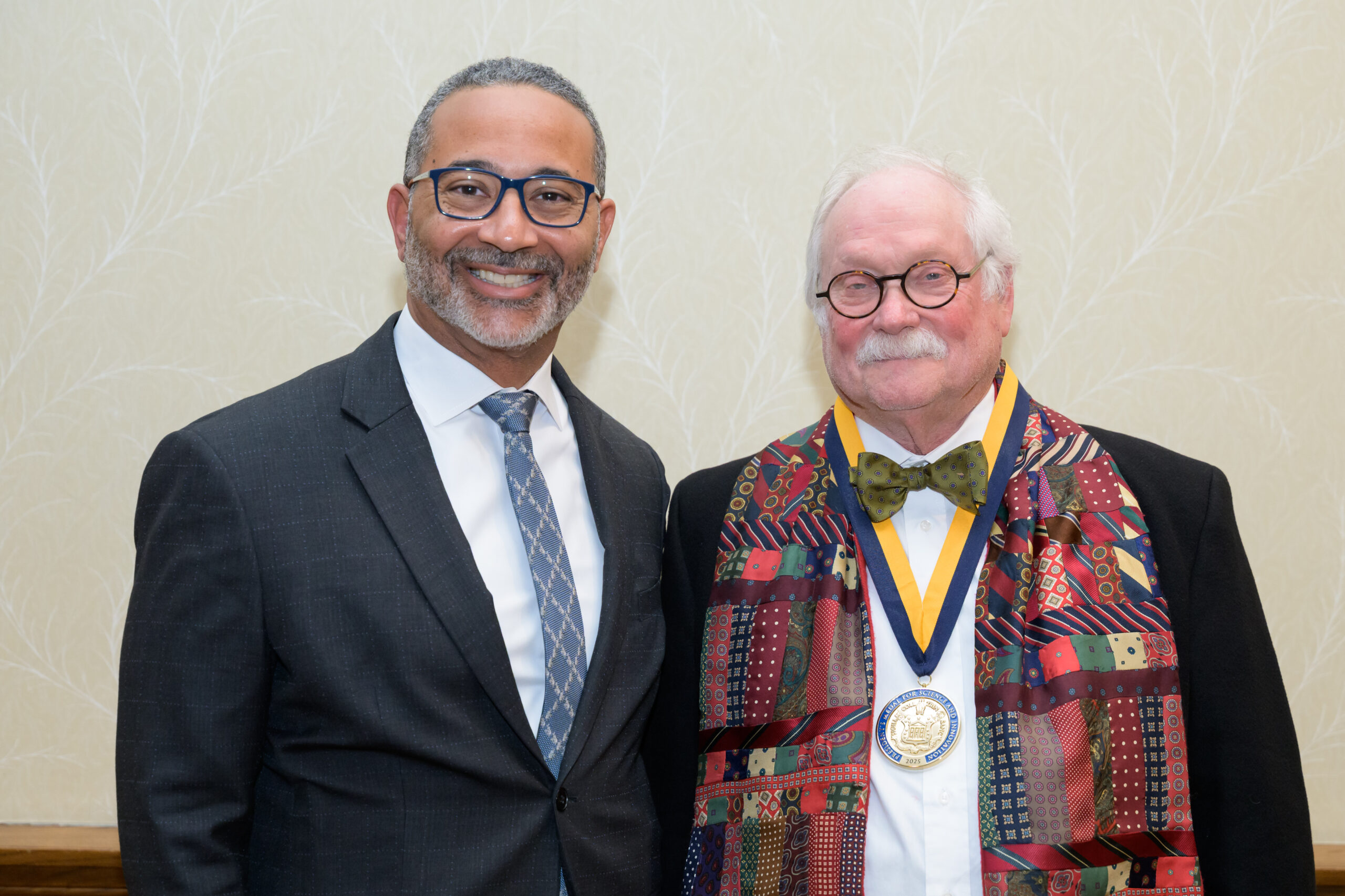 Trinity College President Dan Lugo presents D. Holmes Morton, M.D., IDP’79, H’90 with the 2025–2026 Trinity College President’s Medal for Science and Innovation.