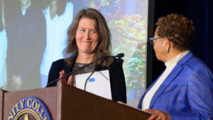 In response to a question from a student in the audience about how to encourage more students of color to pursue STEM fields and to provide them with support, Berger-Sweeney talked about her work to increase the number of faculty members of color at every institution she joins. “You have to change an entire ecosystem to really have an influence,” she said, “but one thing I was absolutely sure would make a difference was if we could bring in more people of color as STEM faculty members, where students could see themselves in those positions.”
