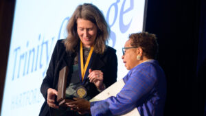 Kaja LeWinn ’98 received the Trinity College President’s Medal for Science and Innovation from President Joanne Berger-Sweeney. Photos by Nick Caito.