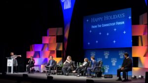 Trinity College students taking courses in computer science were among the audience members at the latest Connecticut Forum event, “Big Tech – What is the Future We’re Building?” The event brought together a panel of three experts to discuss the future of technology at Hartford’s Bushnell Center for the Performing Arts on November 16.