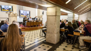 Dean of the Faculty and Vice President for Academic Affairs Sonia Cardenas spoke during the March 25 event about planning around the future of the Rome program. “We are really fortunate to have such strong foundations on which to build. As we think about the next 50 years, we want to be sure that we continue to be strong,” said Cardenas. She noted that three principles are guiding discussions: increased integration of the Hartford faculty and the Rome faculty, as well as the curriculum; a distinctive brand for Trinity’s Rome program; and accessibility—ensuring that any Trinity student who wants to study in Rome will be able to do so.