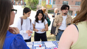 Juan Rayo ’27, Caitlin Doherty ’26, and Maliah Ryan ’25 were volunteering as student members of TrinVotes! to help their classmates get registered.