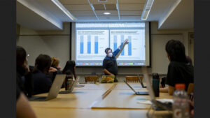 Jacqueline Rabe Thomas M’17, who earned her master of arts in public policy at Trinity College and is now an investigative reporter with Connecticut Public’s Accountability Project, returned to campus in the spring 2022 semester to report on the work that students were doing in an Educational Studies class.