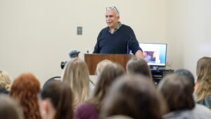Trinity students also were involved in organizing and documenting the visits with the filmmakers. Angelica Gajewski ’26, an English and film studies double-major who worked with the coordinating committee, said she was interested in the relationship between Schrader and Banks as a tangible example of the collaborative nature of both film and literature. “Paul, Linda, and Caerthan all spoke to different aspects of collaboration, with Linda as a film producer and natural connector, and Caerthan taking on the unique role of an intergenerational, legacy-minded collaborator,” Gajewski said. “My hope is that the Schrader/Banks event series offered students a unique and approachable way to engage with film culture, expanding arts engagement on campus and highlighting the diverse ways it can take shape.”