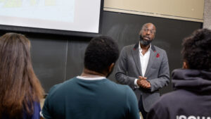 Davarian L. Baldwin, Paul E. Raether Distinguished Professor of American Studies (right), speaks to students at Trinity College. Photos by Nick Caito.