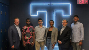Shown at the Trinity Innovation Center are, from left, Barry Stein, M.D, Hartford HealthCare vice president, chief clinical innovation officer; Yves Semana Gisubizo ’24; Albert Ananyan ’24; Anna Chin ’22; Rocco Orlando, M.D., Hartford HealthCare chief of academic affairs; and Mehul Patel, George Washington University graduate administrative student intern with Innovation Hartford Healthcare. Photos by Evan Field.