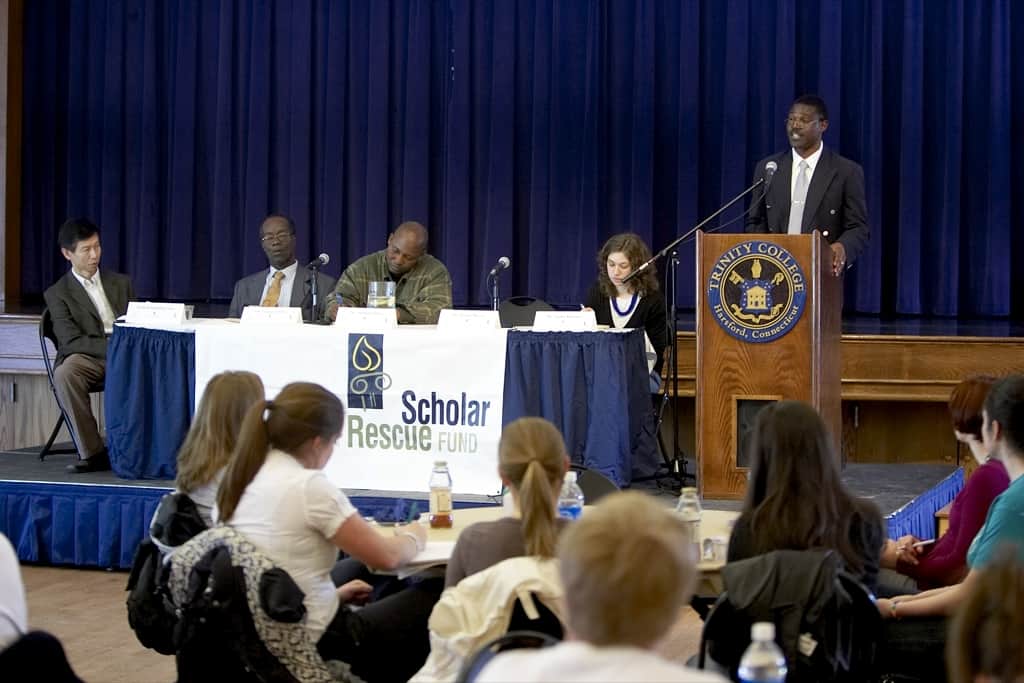 Trinity’s scholar rescue program is a one-year fellowship supported by the International Institute of Education’s (IIE) Scholar Rescue Fund and the Scott Michael Johnson ’97 Memorial Fund, which was established by a former chairman of Trinity’s Board of Trustees, Tom Johnson ’62, Hon. ’05, P ’97, and his wife, Ann. They initiated the fund in honor of their son Scott, a member of the Trinity College Class of 1997 who lost his life in the World Trade Center on September 11, 2001.