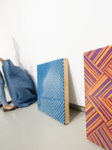 As physical objects, they expand the traditional limitations of painting as two-dimensional, resulting in a novel medium that defies categorization. As visual images, her work is alternately reminiscent of op art, color field painting, landscape imagery, quilt making, or weaving, yet it is none of these.
