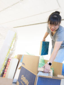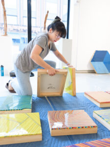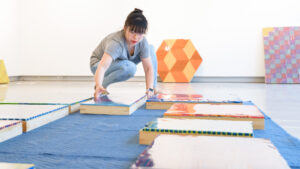 At the Widener Gallery, tiny cubes comprised of segmented slices of Wu’s poured paint, will sit atop a pedestal for visitors to take, bring back to their homes, and document with a photograph. The photographs are included in an ever-growing online gallery, where tiny cubes can be seen resting on leaves or windowsills, traversing nature atop a hiking stick, or interacting with other works of art in galleries.