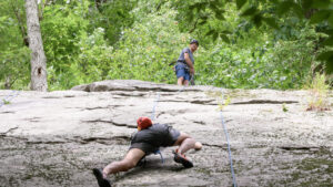 After toting their belongings up stairways and along narrow halls during move-in day, a group of incoming first-year students tackled a larger obstacle: a rock wall.
