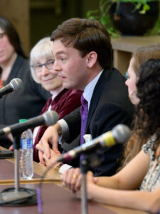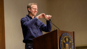 In a conversation with Malcom that was filled with personal anecdotes, Fossum noted that the Emmy Award derives from Immy, a nickname for image orthicon, a camera tube used in television. The Emmy Award statuette consists of a winged woman, representing art, holding aloft an electron, representing science, which seemed an apt symbol for the liberal arts experience, as well.