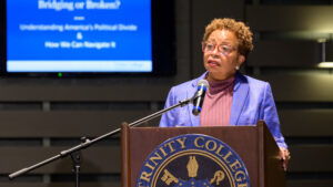 The discussion was part of Trinity’s continuing Bridging Divides series, which was announced by Berger-Sweeney in February 2024 as a way to promote discussions about challenging topics that are shaping viewpoints but also dividing society and civil discourse. The event’s conversation, Berger-Sweeney said, served as a model for how to disagree without animosity, listen empathetically, and engage in meaningful dialogue.