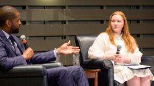During the program called “Bridging Divides: Bridging or Broken? Understanding America’s Political Divide and How Can We Navigate It,” held March 26 in the Cornelia Center, Sellers and Douthat debated the roots of polarization in American politics, its impact on democracy, and whether bipartisanship is still possible in today’s climate.