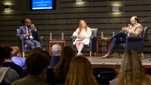 Bakari Sellers, Student Government Association President Ava Caudle ’25, and Ross Douthat.