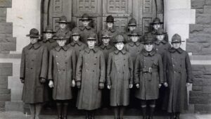 Archival photo of an Army S.A.T.C. group in front of Northam Towers.