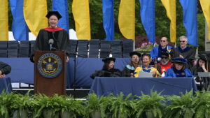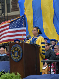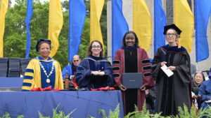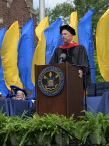 On behalf of the Board of Trustees, Board Chair Lisa G. Bisaccia ’78 presented the awards for faculty, staff, and student excellence. The Trustee Award for Faculty Excellence went to Jennifer Regan-Lefebvre, professor of history. The Trustee Award for Staff Excellence went to Anthony T. Berry, director of admissions. The Trustee Award for Student Excellence went to Class of 2025 graduates Ava C. Caudle and Venghour Than.