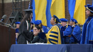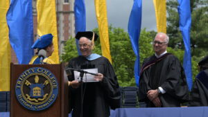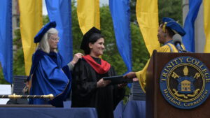 Members of the Class of 2025 also heard remarks from student speaker Theodora Tatsi ’25, who told them that a Trinity education isn’t just a personal achievement but also a responsibility. “Our degrees hold power. Our education holds power. Our whole Trinity experience holds power. And the world needs us to use that power in a meaningful way,” Tatsi said. “If all we do is use this privilege to succeed on our own, then we’ve missed the point. Let’s use it to build, open doors, and create space for those who come after us and, most importantly, for those who were never given a seat at this table.” (Watch the remarks.)