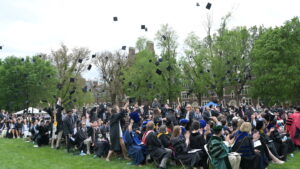 As the ceremony came to an end, Trinity College Alumni Association President Amy McGill Dilatush ’94 welcomed the Class of 2025 into the company of Trinity alumni, numbering 30,000 around the world. She led the new Trinity graduates as they tossed their mortar boards into the air, and the celebrations began.