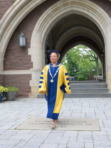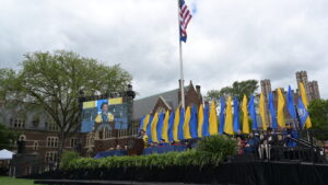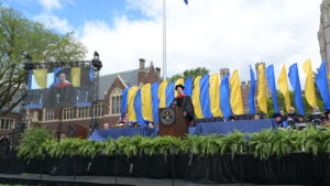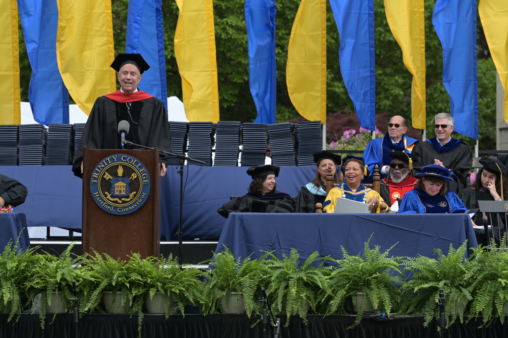 As this Commencement marked President Joanne Berger-Sweeney’s last at Trinity after leading the College for 11 years, she looked back on the time she spent ’neath the elms, referencing a song for each year, which she called “the soundtrack of my presidency.” Berger-Sweeney named-checked Pharrell Williams, Adele, Rihanna, Ed Sheeran, Billie Eilish, The Weeknd, Bad Bunny, Harry Styles, Beyoncé, and even Michael Jackson, before concluding with “For Good,” from the musical Wicked.