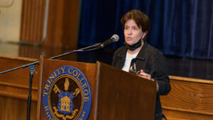 Professor of Religion in Public Life Mark Silk, director of the Leonard Greenberg Center for the Study of Religion in Public Life at Trinity, introduced Swisher and welcomed the audience to the October 21 event in Mather Hall’s Washington Room. Swisher has been an opinion writer for The New York Times since 2018 and is the host of “Sway,” a twice-weekly interview podcast investigating power. Since her early coverage of the technology industry, she has conducted hundreds of face-to-face interviews with powerful figures including Mark Zuckerberg, Elon Musk, Steve Jobs, Bill Gates, and President Barack Obama. She also is a contributing editor at New York magazine and co-host of the podcast “Pivot.”