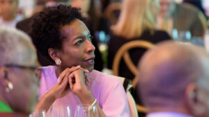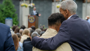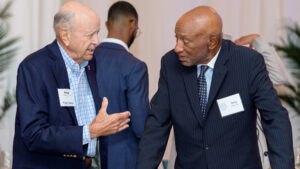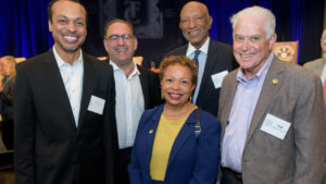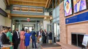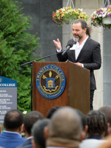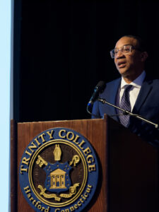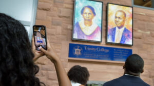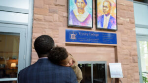 Jeffrey K. Coleman ’01, vice president for diversity, inclusion and community engagement at Framingham State University, spoke also about the importance of building a culture of belonging for these students while underscoring the particular significance of the Borges Center to the Trinity community. “This is the first building at Trinity named after [people] of color,” said Coleman. “This is a statement to BIPOC [Black, Indigenous, and people of color] students that ‘you matter.’ ” Speaking to the crowd gathered outside the center prior to the unveiling of the sign over the doorway and the portraits of his parents inside, Frank noted that “this gift is not about a legacy, because a legacy is behind you. This gift is really about the future,” adding that, “whatever modicum of success we have had, Trinity College was the foundation.”