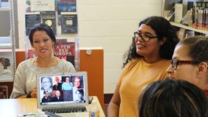 Josselyn Alejandra Zaldívar ’20 presents on the ‘Voces de la Migración’ project at the Hartford Public Library Park Street branch in 2019.