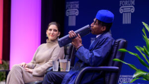 (Left-right) Moderator Hrishikesh Hirway speaks with Suleika Jaouad and Jon Batiste at the Connecticut Forum. Photos by Nick Caito, courtesy of the Connecticut Forum.