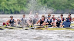 The Trinity 1V8 crew consists of coxswain Alenka Doyle ’26, Wyatt Mills ’26, Jack Carr ’25, Quin Woods ’23, M’25, James McGarry ’26, Jackson Moore ’26, Felix Goldmann ’25, Owen Myers ’27, and Jack Lambros ’26.