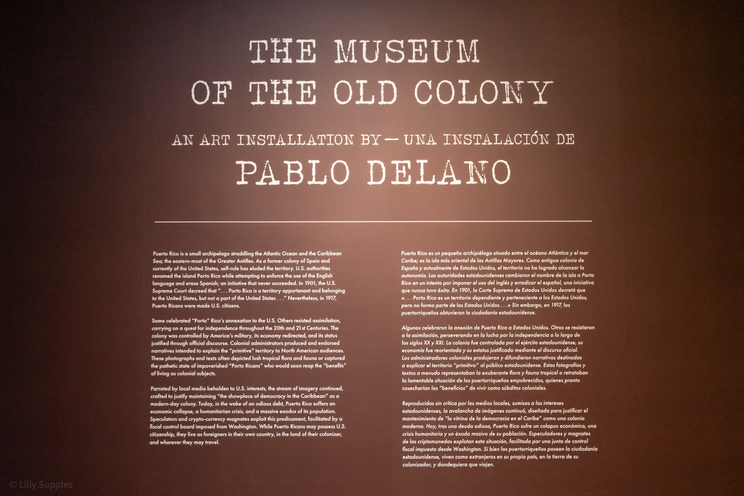 “Sometimes people confuse [the installation] with a historical exhibit, but it’s not that at all,” Delano added. “It’s a very personal retelling of a story through my eyes, my lived experience, and through a carefully chosen set of materials assembled in a way that provokes people to question and think about this colonial condition that we live in.”