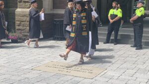 Luther-Roosevelt Stone: In the middle of the Long Walk, a rectangular stone set into the sidewalk commemorates a 1918 visit by former U.S. President Theodore Roosevelt, who was invited by then-Trinity President Flavel S. Luther. Students avoid walking on the stone before commencement, fearing that to do so would prevent their graduating. Stepping—or dancing—on the stone is a favorite commencement tradition.