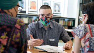Raymond Alvarez-Adorno ’23 on the Long Walk. Photo by Sarah McCoy. The photo at the top of this page is of Alvarez-Adorno in the course ‘Beyond Traditional: Contemporary Understandings of Puerto Rican Culture,’ at Hartford Public Library. Photo by Nick Caito.