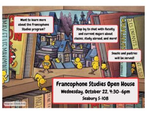 Learn more and about the Francophone Studies Program. Stop by and chat with faculty and current majors about classes, study abroad and more
